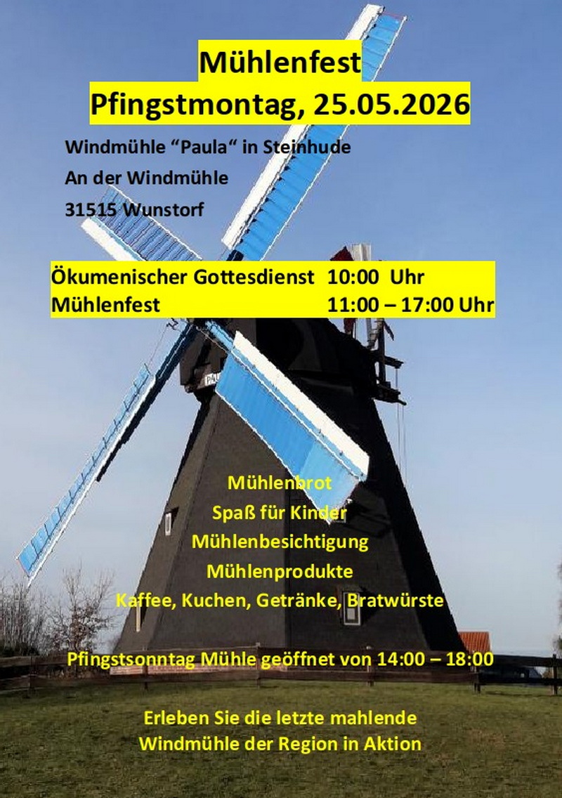 Allgemein Mühlenfest 2026 am Pfingstmontag On 27. April 2026 By Dieter Goldmann Kommentare deaktiviert für Mühlenfest 2026 am Pfingstmontag Follow us About Dieter Goldmann You May Also Like Pfingsten 2023 an der Windmühle Paula 5. Juni 2026 Verknüpfung von Tradition und Nachhaltigkeit 27. April 2026 Sturmfest und Erdverwachsen… 27. April 2026 Previously Wie funktioniert die Windmühle Paula ?